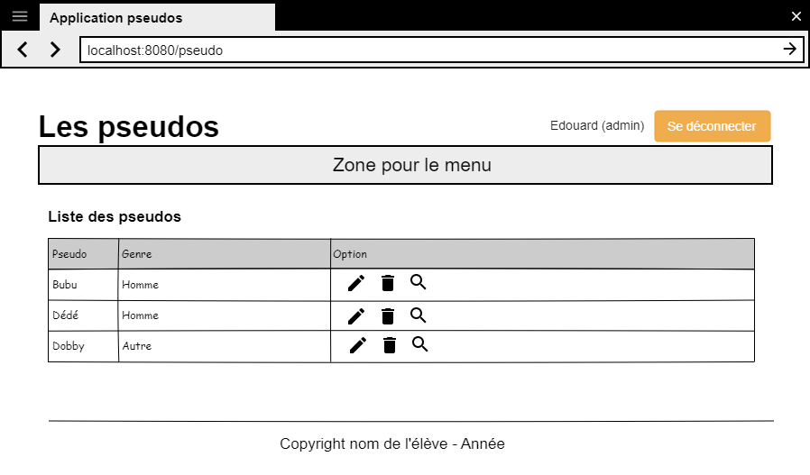Le bouton « Annuler » permet de vider tous les champs. Le bouton « Ajouter » permet de contrôler les champs et si tout est ok, une insertion du pseudo dans la BD est effectuée. Ensuite, on retourne sur la page d’accueil.